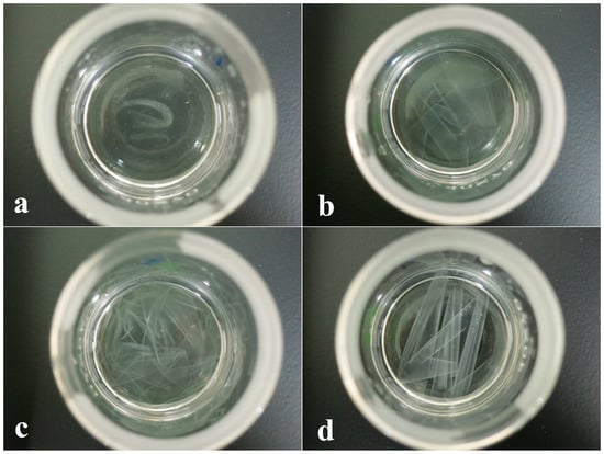 Figure 1 shows the solubility of different blend films after immersion in DMSO for 1 h. APF/G0 was almost dissolved completely (Figure 1a), indicating that DMSO has good solubility for amylose with a linear chain and PVA. With the addition of glutaraldehyde, the profile and morphology of APF/G0.25, APF/G0.5 and APF/G1 were well maintained. The strip-like contour of films became more and more clear with the increase in glutaraldehyde content (Figure 1b–d). The results showed that amylose and the PVA molecule were cross-linked in the presence of glutaraldehyde. It was reported that under acidic conditions, two aldehyde groups on glutaraldehyde could be reacted with hydroxyl groups of amyloses and PVA, and the newly formed molecule was too large to be swelled and dissolved [32]. These chemical bonds formed a stable three-dimensional network structure, much stronger than hydrogen bonds, and enhanced the water resistance of amylose/PVA blend films.