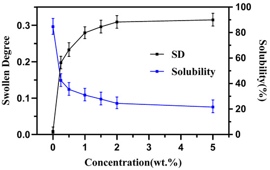 The natural starch, retrograded starch, and other starch without cross-linking can be dissolved by DMSO, but starch is hard to dissolve after cross-linking [24,30,31]. In this manuscript, the solubility in DMSO and SD of cross-linking films was selected to represent the cross-linking degree.