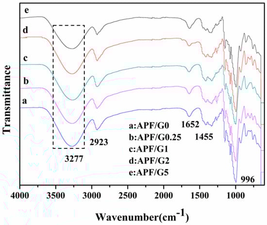 FTIR spectra of (a) APF/G0, (b) APF/G0.25, (c) APF/G1, (d) APF/G2 and (e) APF/G5.