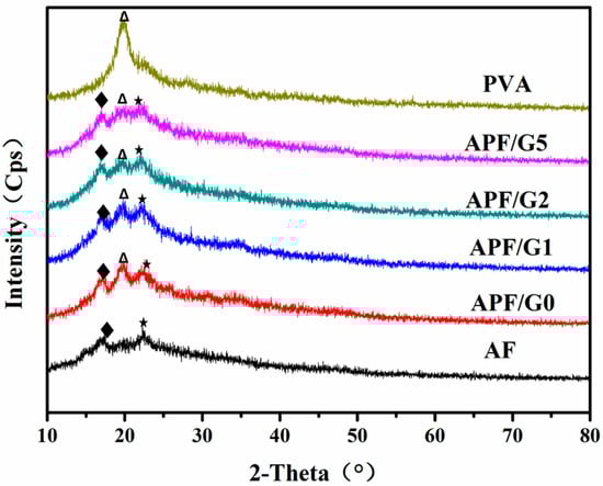 WAXS of APF/G (0, 1, 2 and 5), AF and pure PVA film.