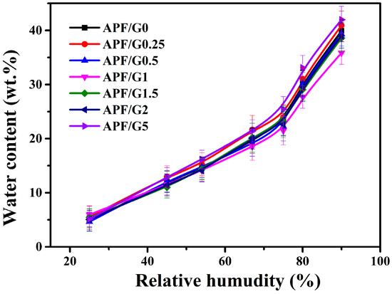 Figure 5 shows the water vapor sorption ability of all samples at different surrounding humidity. The water content of film increased with the increase in RH considerably, especially at RH > 75%. The result showed it was apt to absorb water at a high surrounding humidity for blend film. In addition, the increment of water vapor sorption was mainly due to the phase separation between glycerol and the amylose/PVA matrix when RH exceeded 75%. Before phase separation, the amylose/PVA matrix and glycerol were combined by a hydrogen bond, and the matrix was the main component to absorb water vapor, and the glycerol combined with water too after phase separation [38,39].