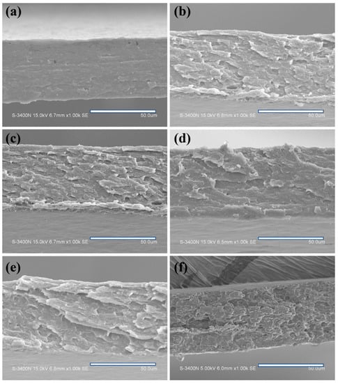 SEM images of stretching section of amylose/PVA blend films ((a) APF/G0, (b) APF/G0.5, (c) APF/G1, (d) APF/G1.5, (e) APF/G2 and (f) APF/G5), at 1000 × magnification.