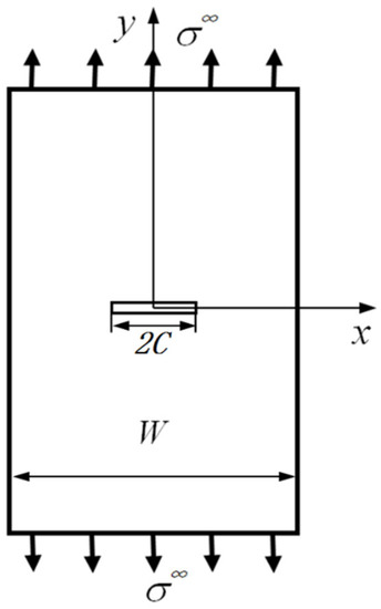Coordinate system establishment and dimensioning of straight-notched laminated plate under tensile load, where stands for the width of the specimen and the length of the straight notch is ; the direction of the tensile load is along the -axis.