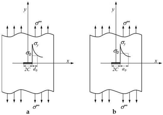 In Equations (6) and (7), it is assumed that is applied parallel to the -axis at an infinite distance (far field) of a plate containing a straight notch of length subjected to a uniform stress; denotes the failure stress of a corresponding non-notched plate.