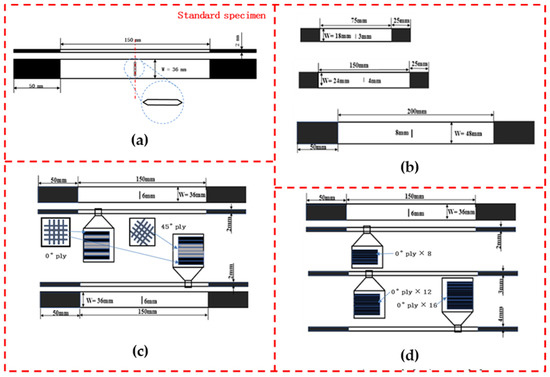 As shown in Figure 3a, the size of specimens is mm; the total thickness of 8-ply composite laminates is mm; and the length of a standard straight notch is mm (W/2C = 6, right on the threshold between infinite and finite width) in line with ASTM D5766 [30]. The clamping end is mm in length and is retained on both sides of the specimen. A straight notch specimen with a crack tip formed due to the limitation of processing technology (as shown in Figure 3a).