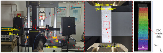 To ensure the measurement quality of digital image correlation (DIC), one surface light source was placed on each side of the testing machine [40]. Full-field surface strain was measured in real time using the ARAMIS v6.3.1 (GOM mbH, BWE, GER). In this study, the pixels of the CCD (charge-coupled device) camera were set to be , and the focal length was mm. The DIC technique was also used to evaluate the local strain concentration on the surface and any damage development in the region of interest [41,42,43]. In order to better implement the DIC measurement on the specimens, the DIC cameras were configured to cover the entire sample area. In this study, non-uniform strain gradients may only develop in a small area near the opening; thus, a sufficient resolution needs to be ensured.