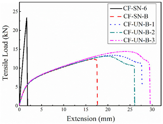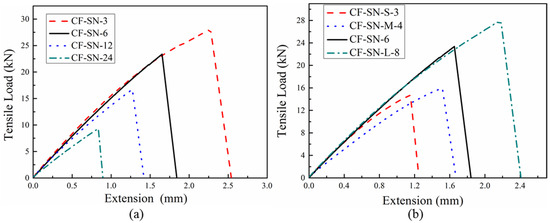Figure 6b plots the force–displacement curves for specimens with different layer thicknesses. Apparently, laminated thickness significantly affects the tensile strength. The greater the thickness the higher the peak tensile load, which bears similarity to the non-notched specimens. Previous studies have shown that specimens with a greater thickness are more likely to be affected by stratification in tensile tests [17]. In this study, specimens with a thickness of 4 mm (CF-SN-ply16) all exhibited certain curve bending in the elastic stage, which is mainly associated with a stratification-induced reduction in tensile strength. Although the ultimate failure of this group of specimens was still fracturing in the fiber and matrix, local delamination still occurred during the loading process.