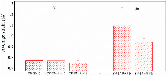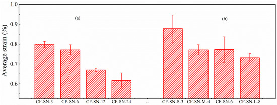 Figure 8 compares the average failure strains for different specimen thicknesses and lay-up sequences. It can be seen that the average failure strain of specimen CF-SN-6 ( mm in thickness and eight layers in lamination) is fairly close to that of specimens with layers and layers (CF-SN-ply12 and CF-SN-ply16, respectively). Thus, the lamination thickness influences only the tensile strength, not so much the stress concentration in the specimen notch. On the contrary, although ply sequences do not have much of an effect on tensile strength, the fiber direction exhibits an evident effect on the strain concentration of the notch.