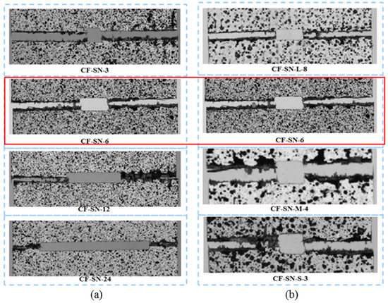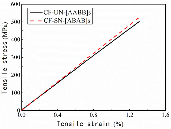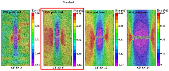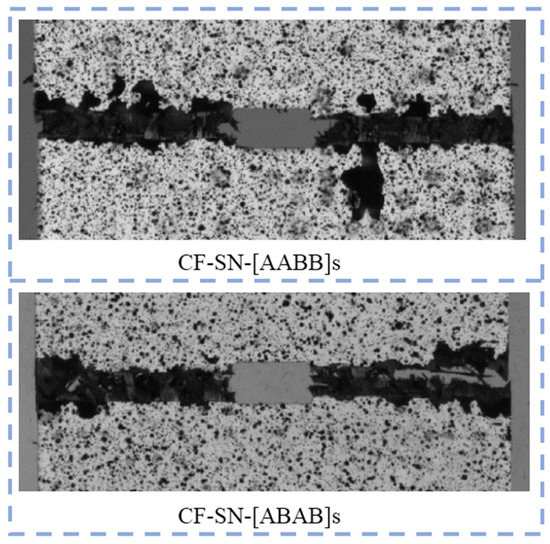 Combining the stress–strain curves in Figure 9 and the average strain diagram in Figure 7, it can be found that the stress concentration at the crack tip of specimen CF-SN-[ABAB]s is more evident than that of specimen CF-SN-[AABB]s (i.e., the average strain of CF-SN-[ABAB]s is higher). By referring to the average strain of the CF-SN-6 specimen, it can be seen that the degree of strain concentration is relatively small for the orthogonal fabric. The orthogonal layer and fiber overlay of an [ABAB]s-type specimen play a key role in bearing mechanical loading. Meanwhile, in [AABB]s-type specimens, the outer four layers () bear stress first, and the inner fiber layers experienced cracking after being stretched. For this reason, the fracture strain detected by DIC on the outer surface is relatively small.