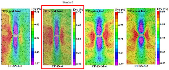 After post-processing the DIC data, the strain contours were obtained. The strain was analyzed for the same specimens with different openings, as well as for different specimens with different opening sizes, to characterize the mechanical properties. Figure 7 compares the mean failure strain of the two groups of straight-notched specimens. In the left part of the graph (Figure 7a), the notch size increases gradually, while the specimen size remains the same. It can be seen that with an increase in the opening size, the strain concentration at the notch edge increases, and the average failure strain decreases. In the right part of the figure (Figure 7b), the size ratio of specimens, , is kept the same as the standard specimen. With increasing crack size, the change in the average failure strain does not seem significant except for CF-SN-S-3. This means that the strain concentration at the crack tip does not increase linearly. This difference provides data for verifying the proposed stress criterion for its suitability to different cases.