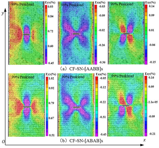 Figure 12 shows the strain field of specimens CF-SN-[AABB]s and CF-SN-[ABAB]s under a 99% tensile load. A rectangular coordinate system is established for discussion here. Assume that the loading direction is and that the corresponding perpendicular direction is , and that the strain in each direction can be displayed by a color contour. As seen in Figure 12a,b, the strain concentrated in the areas around the tips of the straight notch. It can clearly be seen that the longitudinal strain field’s, , upper limit, as well as the difference between the upper limit and lower limit of the CF-SN-[ABAB]s specimen, are greater, meaning that the strain concentration and the failure strain are more manifest. By comparing the strain concentration areas, it is clear that the strain in the axial direction cannot be ignored. In addition, the contour values of shear strain were distributed alternately in positive and negative areas, as shown in strain field .