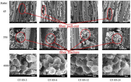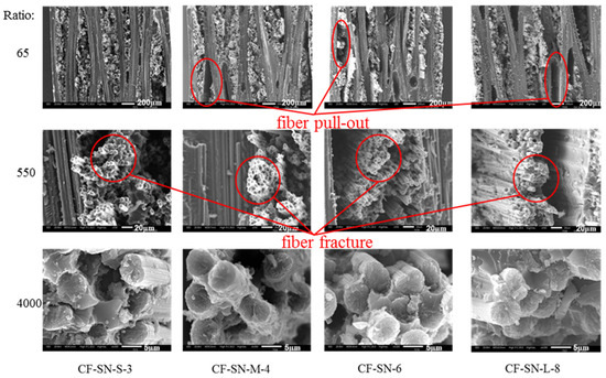 In order to scrutinize the fracture details for analyzing the failure mode in different scales, JMS-IT300 scanning electron microscopy (SEM) was used to magnify the failure site 65, 550, and 4000 times; the corresponding images are displayed in Figure 13, Figure 14 and Figure 15. By combining such images with those presented Figure 16 and Figure 17, the failure modes of each sample can be analyzed from the viewpoints of fiber, fiber bundles, and the overall levels of the specimens.