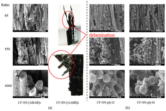 SEM images of the fracture position of the specimen group (a) with different lay-up sequences and (b) with different layer numbers. The specimen containing 45° fiber orientation was pulled out and the lay-up was delaminated severely, and small pieces of broken fiber can be seen in thicker specimens.