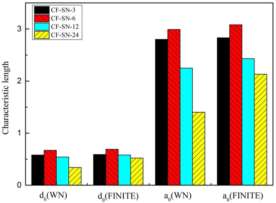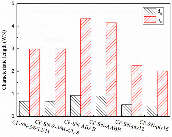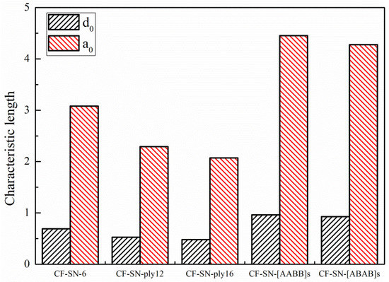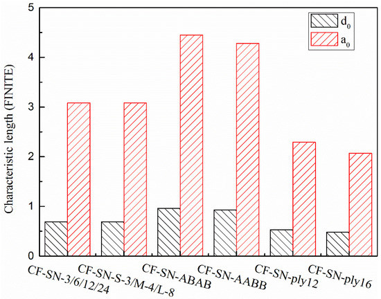 Table 2 summarizes the ratio of the peak tensile load to the tensile strength of non-notched counterparts with different notch sizes, different lay-up sequences, and different sample thicknesses. The tensile strength ratio quantifies the tensile strength of the notched specimen with respect to the tensile strength of the intact specimen with the same overall size. The notch sensitivity signifies another parameter that represents the change trend in the strength of the material due to the presence of a notch; its value is inversely proportional to the tensile strength ratio [44]. In general, the greater the notch sensitivity the lower the strength of the material [45]. With an increasing notch size the notch sensitivities of both the equal ratio () group and the equal size group increase, indicating that the notch size affects the strength of the laminates. When the notch size increases from to mm, the notch sensitivity of the equal size plate and equal ratio plate increases by and , respectively. This means that the size of the specimen considerably affects the stress state of the specimen.
