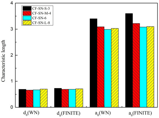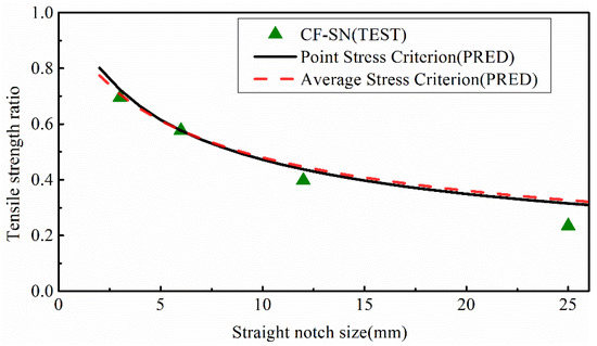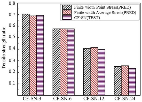 As shown in Figure 5b, the label of testing specimens indicates that the specimen size gradually expands with an increasing notch size to retain the same size ratio, such that the size effect can be ignored. The ratio between the cross-sectional areas of the joints on both sides of their notches is the same as that of non-notched plates with the same size. The larger the plate size, the higher the peak load. The slopes of the load–displacement curves obtained by the group of specimens in Figure 5b are fairly similar, except for CF-SN-M-4, which might be because of the error caused by processing the small-sized specimen with the same-sized cutter. It indicated that the specimens in this group are not substantially affected by the size when ignoring CF-SN-M-4, and they can be used as a representative group to verify the accuracy of the proposed stress criterion formula.