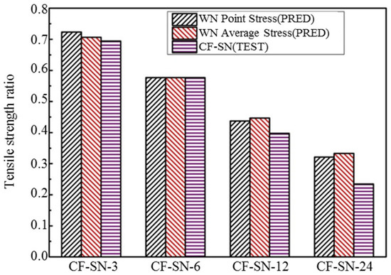 When comparing the notch sensitivities of the CF-SN-[AABB]s, CF-SN-[ABAB]s, and standard specimens, the type of lay-up exhibits noticeable influence on the stress state in the specimens, while the lay-up sequence has relatively little influence. It can be seen that, for straight-notched laminates, the 45° lay-up makes them have a higher strength ratio. From comparison of the 12-layer, 16-layer and standard (8-layer) specimens, it can be seen that the notch sensitivity increases with the number of layers.