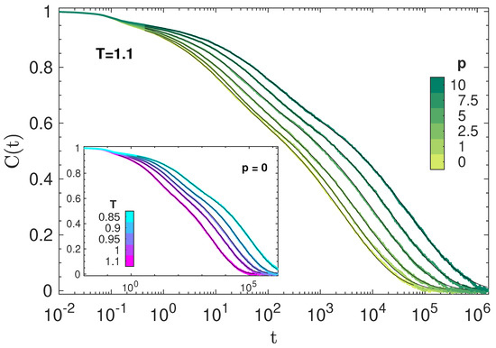 At long times, the shape of the BCF decay does not depend on the physical state. To show that, Figure 2 plots the master curve obtained by shifting the curves of Figure 1 horizontally, resulting in a remarkable time–temperature–pressure superposition (TTPS) in the time window of primary relaxation for . The best fit of the master curve with the stretched exponential , where A is an adjustable constant, yields .