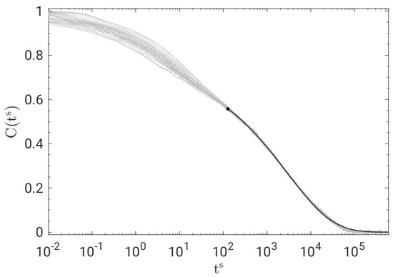 Time−temperature−pressure superposition (TTPS) of BCF for all the states in Figure 1. The curves are shifted along the horizontal axis to optimise their superposition at long times. The superimposed solid black line is the best fit with a stretched exponential proportional to , Equation (2), with .