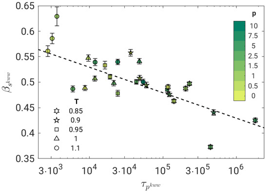 Stretching parameter of the secondary JG relaxation of all the investigated states according to the best fit with Equation (8). The dashed line is a guide for the eyes. Stretching increases mildly with the primary relaxation time.