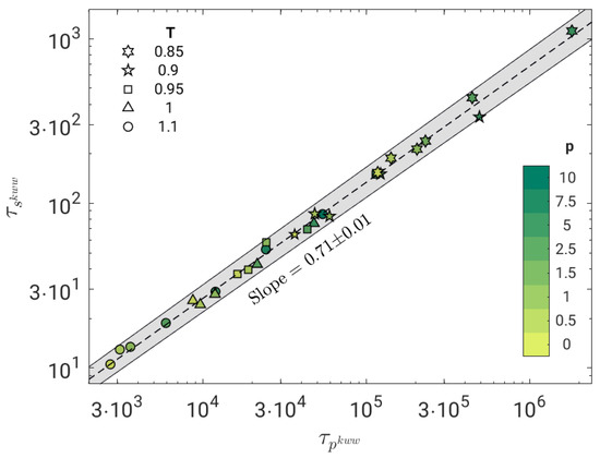 We now test the possible correlation between the time scales of the primary, , and the secondary JG, , relaxation processes. Figure 5 shows the result by fitting the BCF in terms of Equation (8). The correlation is excellent (Pearson correlation coefficient ) and well-expressed by a power law with exponent .