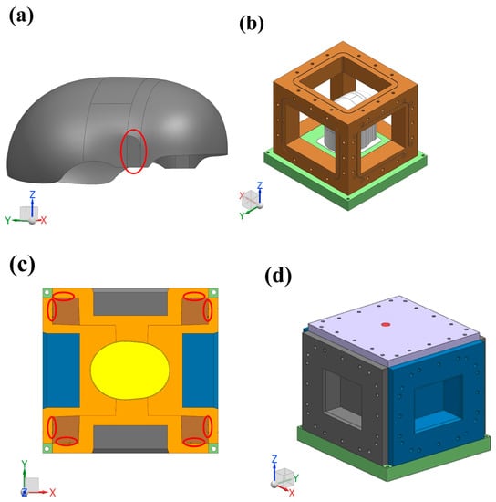 M-CRTM molding process with adjustable injection gap: (a) the designed composite helmet model; (b) the positioning frame of female molds; (c) cross-sectional view of female mold pre-assembly; (d) multi-direction compression and locking of the mold.