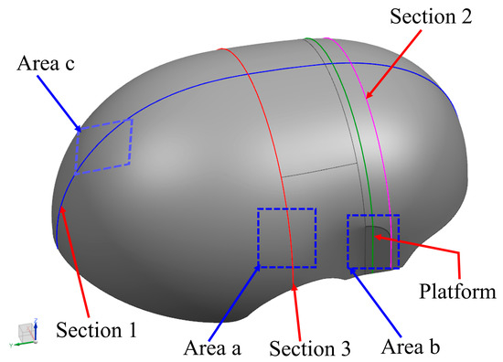 In order to further study the tendency and mechanism of curing deformation, the cross-section curing deformation of the helmet shell was studied in this paper. Firstly, three representative sections (as shown in Figure 2) were selected to analyze their deformation laws, and then the 3D coordinates of points on the sections were extracted to analyze the deformation modes of the sections.
