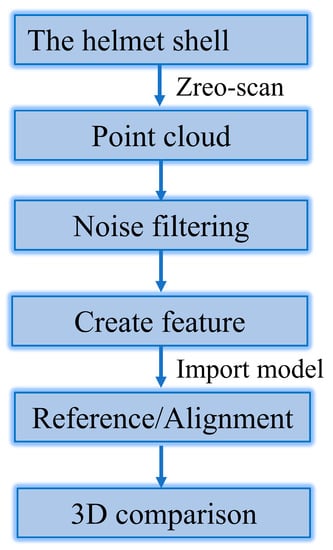 As previously mentioned, the helmet shell is a special-shaped, curved structure unlike the flat plate or L-shaped models, which can be used to directly compare the warpage or spring-in. Therefore, a method is needed to quantify the curing deformation of complex-shaped structures. Reverse engineering can be used to obtain a surface point cloud of the model through 3D scanning technology, and then reverse engineering software can be used to process this point cloud to obtain the surface shape of the tested sample. Therefore, reverse engineering is often used to detect the deformation between the manufactured sample and the original model. For example, Xiang [26] used a 3D laser scanner to scan the helmet surface and compared the data with the CAD model to evaluate its deformation. In this paper, the Zero-Scan optical projection 3D scanner was used to obtain the surface profile of the composite helmet used for curing deformation analysis. The Zero-Scan optical projection 3D scanner is a non-contact full-field 3D optical measuring device with a measuring accuracy of 0.02 mm. In the scanning process, the sensor calibration and point cloud data acquisition are completed by PC-DIMIS software. Since denser point clouds can create more accurate models, the total point cloud data of each helmet housing in this paper amounted to at least 6 million points. The scanned point cloud data were then imported into the Geomagic® software (3D Systems®) in bin format for filtering and noise reduction, followed by optimization and model reconstruction. Then, the reconstructed model was compared with the helmet design model to obtain the curing deformation of the helmet shell. The specific measurement steps are shown in Figure 3.