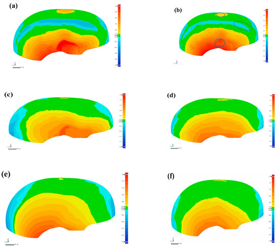 According to the measurement method shown in Section 2.4, this paper compares the curing deformation of the three groups of helmet shells. The overall curing deformation results of the helmet shell are shown in Figure 4. Figure 4a,c,e show the helmet shell prepared by the RTM method, and Figure 4b,d,f show the helmet shell prepared using the M-CRTM technique. It can be seen that although the manufacturing technique is the same, the curing deformation of the shell is slightly different. The reason for this result is that the structure of the helmet shell presents complex characteristics, and its processing technique has a partial influence on the curing deformation.