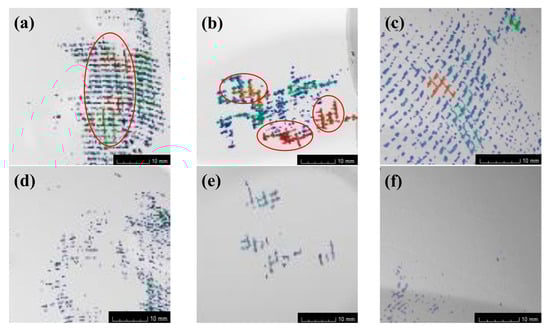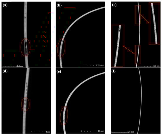 Micro-CT internal voids detection: (a–c) defects of samples prepared by RTM process; (d–f) internal defects of samples prepared by M-CRTM process.