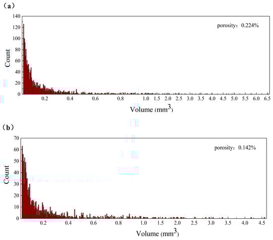 Subsequently, a statistical analysis of the size distribution of the void volume inside the helmet shell was performed, and the results are shown in Figure 6. Figure 6a shows the size distribution of micro-voids for the RTM-molded helmet shell, and the total void content is 0.224%. As can be seen from the figure, the interior void volume of the sample is widely distributed, with a total void volume of 436.202 mm3 and a maximum void volume of 6.6mm3. The volume of most voids was below 2 mm3, and the number of voids above 2 mm3 was 22, accounting for 17.75% of the total void volume. Figure 6b shows the size distribution of the M-CRTM-molded helmet shell with a porosity of 0.142%, a total void volume of 276.394 mm3, and a maximum void volume of 4.574 mm3. The volume of most of the voids in the M-CRTM molded helmet was below 1 mm3, and the number of voids with a volume size greater than 2mm3 was 11, accounting for 11.54% of the total void volume. Compared with the RTM-molded helmet, the porosity of the M-CRTM-molded helmet was reduced by 36.6%, and the number of voids was significantly reduced. In addition, in the area (Figure 5b) where the curvature of the shell changes greatly, large voids will be generated because the air bubbles are not easily discharged from the mold. Large voids do not only affect the mechanical properties of manufactured parts [15] but also affect the stress distribution of cured composites, and even cause increased stress concentration [18]. However, the number of large voids in the composite helmet shell prepared by the M-CRTM process is significantly reduced. This is because the composite helmet shell reserved a 0.5 mm gap during the injection process, which reduced the fiber volume fraction from 58.8% to 41.5%. This improvement significantly increased the fabric permeability and improved the forming quality of the composite helmet.