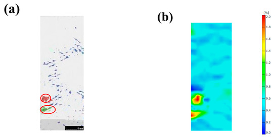 In order to study the effect of local voids on the stress distribution of composite materials, a tensile test sample was obtained from the helmet prepared using the RTM method. Firstly, a CT scanning experiment was carried out to obtain the distribution of internal voids, and then the digital image correlation (DIC) system was used to capture the strain field of the sample in the tensile test. The results are shown in Figure 8. In Figure 8a, the red and green areas are the distribution locations of large voids (the red ellipses mark locations), and the blue areas are the distribution locations of small voids. Figure 8b shows the strain field distribution of the corresponding sample during the tensile process. It can be seen that stress concentration occurs at the locations of large voids, while the location of small voids has little effect on the stress distribution. The above results demonstrate that the voids in the helmet sample will cause uneven stress distribution and an even stress concentration.