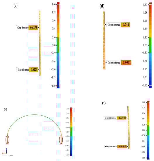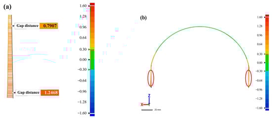 Figure 10 is the curing deformation distance diagram at different positions of Section 2. In this figure, 400 points were equally selected along the section to analyze the curing deformation trend at this position. The position of the midline (Section 1) was taken as the 0 point, the point on the left was from −200 to −1, and the position point on the right was from 1 to 200. It was specified that the outward deformation is a positive value and the inward deformation is a negative value.