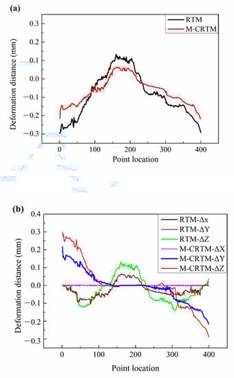 Figure 10 shows the deformation distance along the midline (Section 1) of the helmet shell. It can be seen that the RTM-molded helmet shell had the largest positive deformation (0.133 mm) and the largest negative deformation (−0.298 mm) along the midline section, which were larger than the maximum positive deformation (0.064 mm) and the maximum negative deformation (−0.217 mm) of the M-CRTM-molded helmet. This may be due to the fact that the internal defects of the RTM-molded helmet shell reduced the stiffness of the parts and the deformation resistance of the sample, resulting in the specimen being more prone to shape changes after demolding. In addition, both molding methods showed a trend of positive deformation in the middle and negative deformation at the edges on both sides. The reason for this trend is that the shape change at the edge positions on both sides was large due to the release of internal stress. Figure 10b shows the components of the deformation in the X, Y, and Z directions for this cross-section. It can be seen that the deformation along the central line was small in the X direction, indicating that the deformation in this section had little relationship with the X deformation. At the same time, the curing deformation on both sides mainly came from the deformation in the Y direction, which was also the main reason for the negative deformation. In addition, the positive deformation in the middle region mainly came from the Z direction, which was the main reason for the positive deformation. By comparing the curing deformation displacement of the two types of helmets, it was found that the M-CRTM method obtained a smaller curing deformation in the Y direction and the Z direction. This proves that the proposed molding process has a positive effect on improving the overall shape retention of the helmet shell.