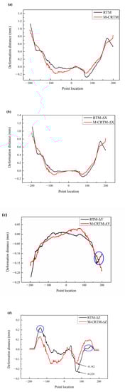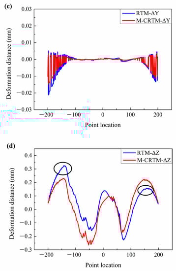 Subsequently, we studied the deformation components in the X, Y, and Z directions of Section 3, as shown in Figure 11d and Figure 12b. From the curing deformation distance in the X direction shown in Figure 11b, it can be seen that when the measurement point was located at the right edge, the deformation displacement of the M-CRTM-molded sample was larger at the same position. When the measurement point was located on the left edge, the deformation displacement of the RTM-modeled sample was larger at the same position. This indicates that the RTM-molded helmet shell was more deformed in the positive X direction compared to the M-CRTM-molded sample. Moreover, by comparing Figure 12a,b, it can be seen that the deformation of the RTM-molded shell in the X direction is similar to that of the overall deformation, indicating that the deformation of Section 3 was also mainly affected by the deformation in the X direction. From Figure 12c, it can be seen that the deformation displacements of the two molding methods in the Y direction are very small, which indicates that the position of Section 3 was less affected by the deformation in the Y direction. Figure 12d exhibits the deformation distance component of Section 3 in the Z direction. It can be seen that the deformation of the RTM molded helmet shell in the Z direction of Section 3 is larger on the left side and smaller on the right side (the black marked area), which indicates that the helmet shell produced deflection deformation in the Z direction. A comprehensive comparison of the offset distance in each direction shows that the curing deformation in the left direction of Section 3 mainly occurred in the positive X direction, followed by the displacement deformation in the positive Z direction for the helmet shell prepared by RTM. That is, the X–Z deflection deformation mainly occurred in the rear of the helmet shell.