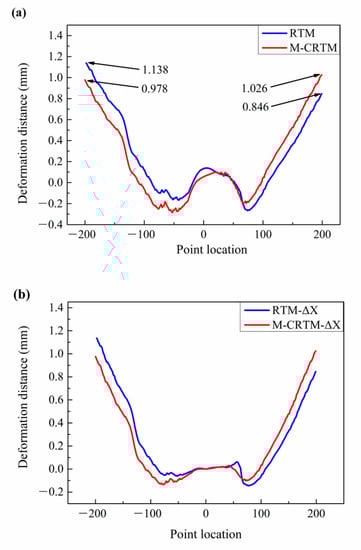 The curing deformation diagram of Section 3 is shown in Figure 12. As can be seen from Figure 12a, the deformation of the RTM-molded helmet shell presented prominent asymmetry on the left and right sides. The maximum positive deformation on the left and right sides reached 0.846 mm and 1.138 mm, respectively, with a difference of 25.7%. The reason for this result is that the large difference in local porosity (as shown in Figure 4a) after curing leads to an uneven distribution of internal stress, resulting in a certain degree of torsional deformation. However, the difference in the curing deformation on both sides of Section 3 was small for the M-CRTM-molded helmet. The maximum positive deformations on the left and right sides were 1.026 mm and 0.978 mm, respectively, and the difference was only 4.7%. This result proves that by improving the molding process and improving the forming quality, the amount of curing deformation can be reduced.