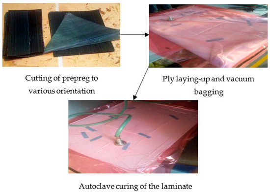 The laminates were covered with the release film and breather before enclosing them in a vacuum bag, as shown in Figure 1. Afterwards, the setup was heated inside an autoclave from 25 °C to 100 °C at 2 °C/min heating rate and a constant pressure of 6 bar. Then, the process was held under an isothermal condition at this temperature for 180 min before cooling to 25 °C at 3 °C/min. The laminates were evacuated from the autoclave and then demoulded before cutting them into the required dimensions.