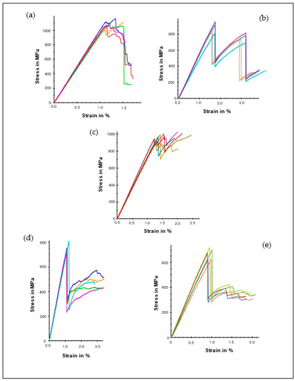 The relationship between material stress and strain under tensile loading is presented in Figure 4, while the average tensile stress, , and modulus, , are also shown in Table 3. As can be seen, the specimens exhibited a similar trend as in the case of the flexural properties by undergoing a linear relationship in their elastic zone before experiencing a brittle rupture due to the breakage of the fibres. LM1 demonstrated the highest of 1220 MPa and of 115.0 GPa compared to the other sample. This is due to the longitudinal arrangement of the fibre, which provides high resistance towards tensile loading [31,37,38]. On the other hand, LM2 and LM3 exhibited of 859 MPa and 808 MPa, respectively, while their elastic modulus is almost average of LM1. When plies are substituted with plies, as in the case of LM2 and LM3 layup, the number of carbon fibres parallel to the longitudinal loading of the composite decreases, resulting in lower modulus and tensile strength than LM1. Likewise, LM4 and LM5 with multilayer configurations possess lower and than LM1, LM2 and LM3. Even though there are multiple orientation configurations, one could reasonably deem that transverse and off-axial detachment of the fibre significantly affects the overall resistance of the laminates.