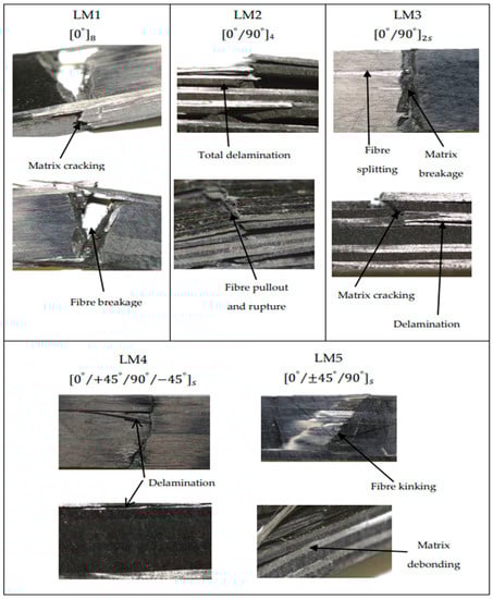 An essential factor determining the type of failure exhibited by a composite laminate is the ply stacking sequence that also determines the orientation of the fibre [20,48,49]. Other common influences include the nature of material composition and the type of load applied. Figure 6 illustrates the optical micrograph of the specimen under flexural loading. As can be seen for the unidirectional laminate (LM1) case, the sample failed by transverse cracking of the matrix and fibre breakage, resulting in a drastic fall of the flexural stress, as shown in Figure 2a. On the other hand, LM2 exhibited high interlayer delamination between stacking configuration, as revealed in Figure 6. This confirmed the unbalanced stress distribution in Figure 2b. Moreover, fibre rupture along the longitudinal direction was noticed. Likewise, LM3 displayed a similar mode of failure as LM2 but minimal interlayer delamination due to the symmetry and balanced nature of the cross-ply laminate. Additionally, LM4 and LM5 exhibited lower interlayer delamination than other specimens, while fibre kinking and matrix debonding were also observed.