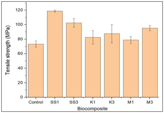Tensile strength of unfilled (control), snail shell nanoparticle—(SS), montmorillonite—(M), and kaolinite—(K) filled greenpoxy nanocomposite.