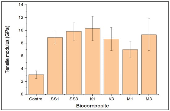 Tensile stiffness of unfilled (control), snail shell nanoparticle- (SS), montmorillonite- (M), and kaolinite- (K) filled greenpoxy nanocomposite.