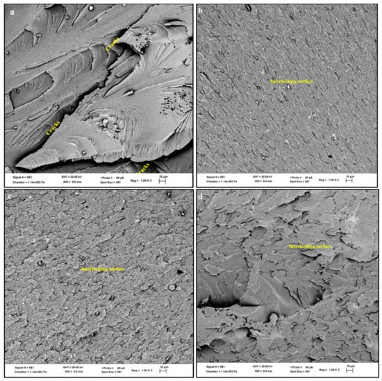 Furthermore, the inclusion of snail shell nanoparticles probably induced crack arresting and a pinning mechanism in the matrix at the initial stage, serving to block crack propagation [13,33,35]. A more rigid surface texture and tiny cracks were seen on the fracture surface of the 1 wt.% kaolinite-reinforced nanocomposite shown in Figure 3d. This SEM image also shows the uniform dispersion of nanoparticles as it is challenging to see nanoparticles on the fracture surface. This strict structure may have provided internal stiffness, which eventually reduced plastic deformation and resisted shock and water permeation, resulting in improved stiffness, impact resistance, and low water uptake, as seen in Figure 2 and Figure 4.