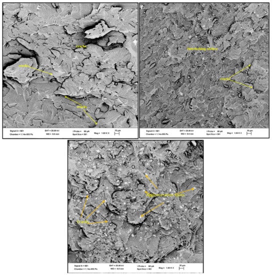 Similarly, the fracture surface of the nanocomposite with 1 wt.% montmorillonite revealed an interlocking structure with a homogeneous dispersion of nanoparticles and limited tiny cracks, which supported the improved mechanical properties observed. The fracture surface of the nanocomposite with 3 wt.% was dominated by microcracks and agglomeration spots; meanwhile, for the nanocomposite reinforced with shell snail nanoparticles, no cracks or agglomeration were seen.