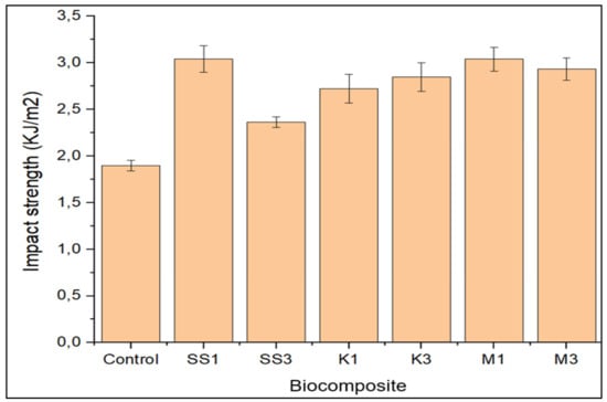 Impact strength of unfilled (control), snail shell nanoparticle—(SS), montmorillonite—(M), and kaolinite—(K) filled greenpoxy nanocomposite.
