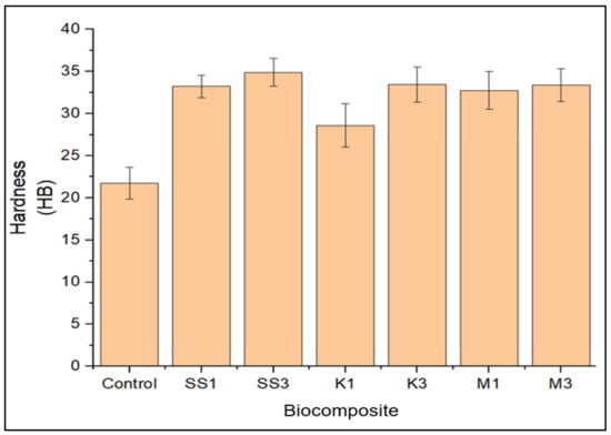 Hardness property of unfilled (control), snail shell nanoparticle—(SS), montmorillonite—(M), and kaolinite—(K) filled greenpoxy nanocomposite.