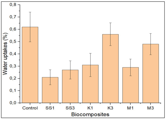 The water uptake (WU) for the pure greenpoxy, snail shell nanoparticle-, montmorillonite-, and kaolinite-filled greenpoxy nanocomposites is shown in Figure 6. It was observed that the incorporation of snail shell nanoparticles, montmorillonite, and kaolinite nanoparticles at low concentrations of 1 wt.% significantly decreased the absorption of greenpoxy. The hydrophobic nature of the nanoparticles served as a barrier for water permeation into the nanocomposite. Homogeneous dispersion in a small concentration of nanoparticles may be another reason for the reduced absorption rate observed. Furthermore, a sharp drop in the water absorption rate after introducing nanoparticles may have been attributed to closer packing from the homogenous dispersion of the nanoparticles, which produced a more rigid structure that resisted water penetration. This trend is consistent with the literature in which the loading of nanoparticles reduced water uptake [13,33].
