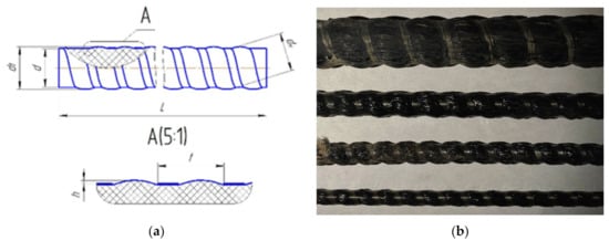 The profile and key of the rebar sizes are shown in Figure 1. The rebar with the diameter d, with a step t, and wavy protrusions of height h rise, forming the outer diameter of the bar d1, is according to Table 1.