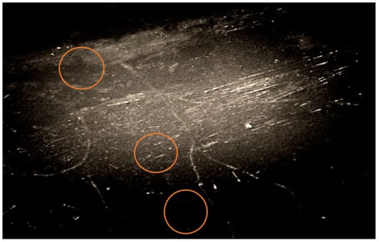 The result of the monolithic studies shows (Figure 8) that on the right side of the BFRP rebar, which was exposed to solar radiation, the penetration of the dye was more intense, filling the surface layers of the degraded surface layers. In the bio-infected samples, the time until the first point of dye appeared on the end of the sample was four times less, which shows a higher dimension of the formed pores due to the penetration of mold mycelia.