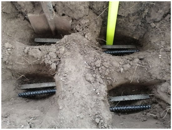 At the second stage, in order to study the process of biodamage of the BFRP rebars by microorganisms, test samples were placed in the soil at a depth of 20 cm. The experimental exposure time was also one year (Figure 6).