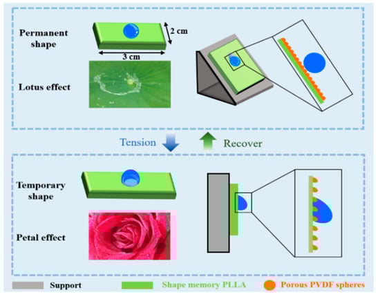 - Shao, Y.; Zhao, J.; Fan, Y.; Wan, Z.; Lu, L.; Zhang, Z.; Ming, W.; Ren, L. Shape memory superhydrophobic surface with switchable transition between “Lotus Effect” to “rose petals effect”. Chem. Eng. J. 2020, 382, 122989. [Google Scholar] [CrossRef]