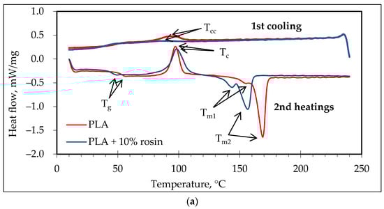 DSC cooling curves (Figure 6a,b) show that rosin had a significant influence on the peak crystallization temperature when cooling (Tcc) multifilament yarns. Pure PLA multifilament yarns had a clear peak Tcc compared with PLA modified with rosin. The reason why the peak of cold crystallization disappears is that rosin affects the integrity of the PLA crystal and prevents the regular accumulation of molecular chains. This is corroborated and proved by the lower crystallinity (Xc) of PLA/rosin compared to pure PLA. These results correlate with the works of other authors [47,48], where it was estimated that high concentrations of additives reduce PLA’s ability to form the normal polycrystalline structure of the polymer, As a result, there is a decrease in the crystallinity of the composite material.